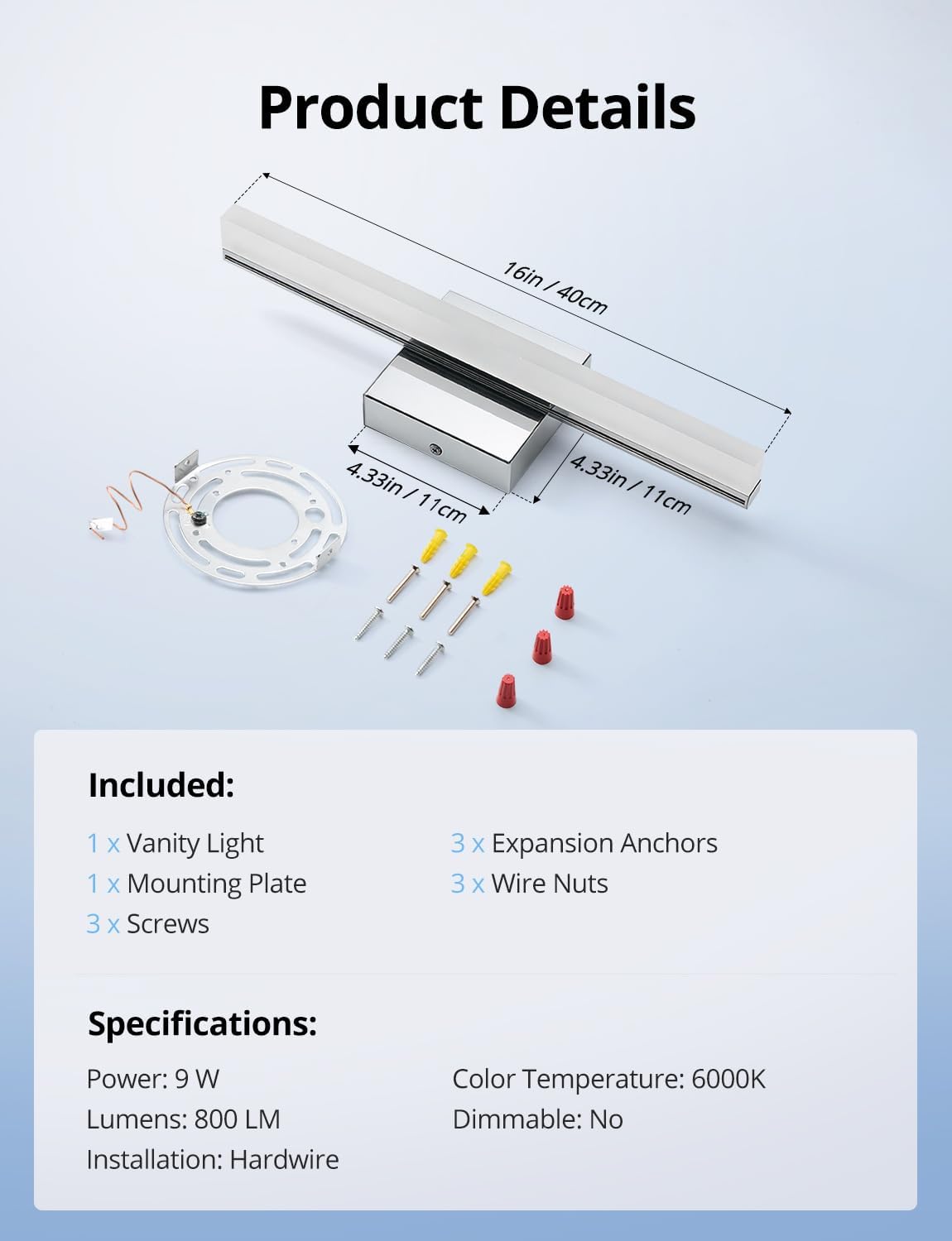 | Included Components | 1 x Banthroom Vanity Light, 3 x Expansion Anchors, 3 x Screws, 3 x Wire Nuts, Mounting Hardware |
