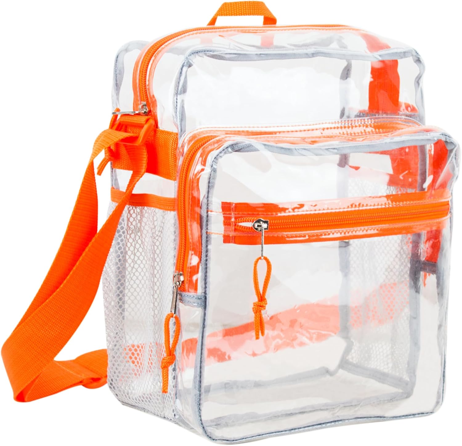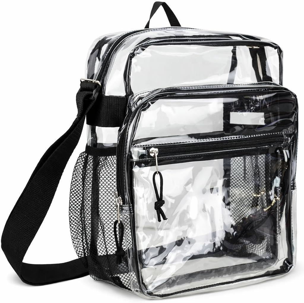 FEATURES: Hands-free carrying with an adjustable webbing strap (28"-56"), front pocket, a firm front flap for shape retention, and two side mesh pockets for on-the-go hydration (water bottle pockets) perfect clear work bags for women and men.