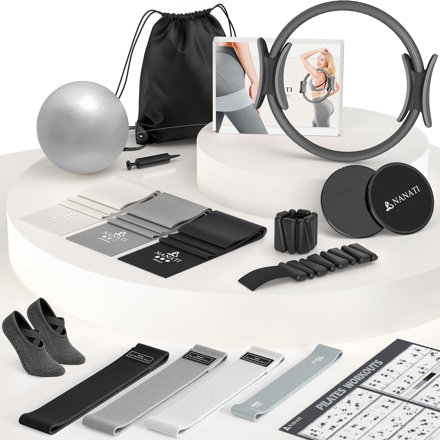 | Included Components | 1 Silicone Resistance Bands & 3 Fabric Resistance Band & 3 Elastic Stretch Bands, 14.5" Pilates Ring & 9.8" Pilates Ball, 2 Ankle Wrist Weights (1 lb each) & 2 Core Sliders, A Pair of Pilates Socks & A Storage Bag, Air Pump & Inflatable Tube & Pilates Workout Guide |