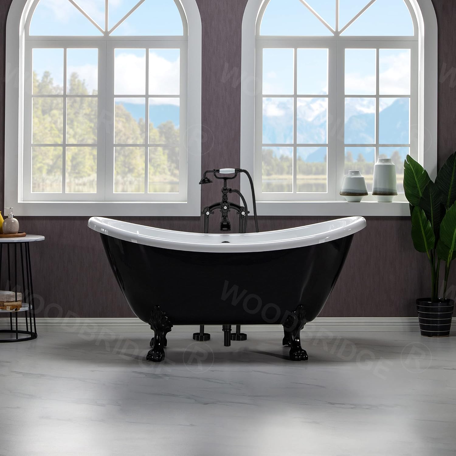 Experience luxury and comfort with our WOODBRIDGE clawfoot bathtub, crafted from 100% high gloss black LUCITE acrylic and reinforced with ASHLAND resin and fiberglass. This freestanding, rectangular tub measures 59 inches long, 28.375 inches wide, and 29.5 inches deep, offering ample space for a relaxing soak. Its double slipper design and gently sloping lines provide exceptional comfort, while the brushed nickel feet and drain add a touch of elegance. The tub's exterior is black, with a white interior, and it has an effective capacity of 55 gallons. Enjoy easy cleaning and maintenance with our EnduraClean surface, which resists stains and scratches, maintaining its high gloss finish. This bathtub is compliant with US and Canadian standards and meets the Massachusetts Plumbing and Gas Code. Our US-based product support team is ready to assist with any queries.